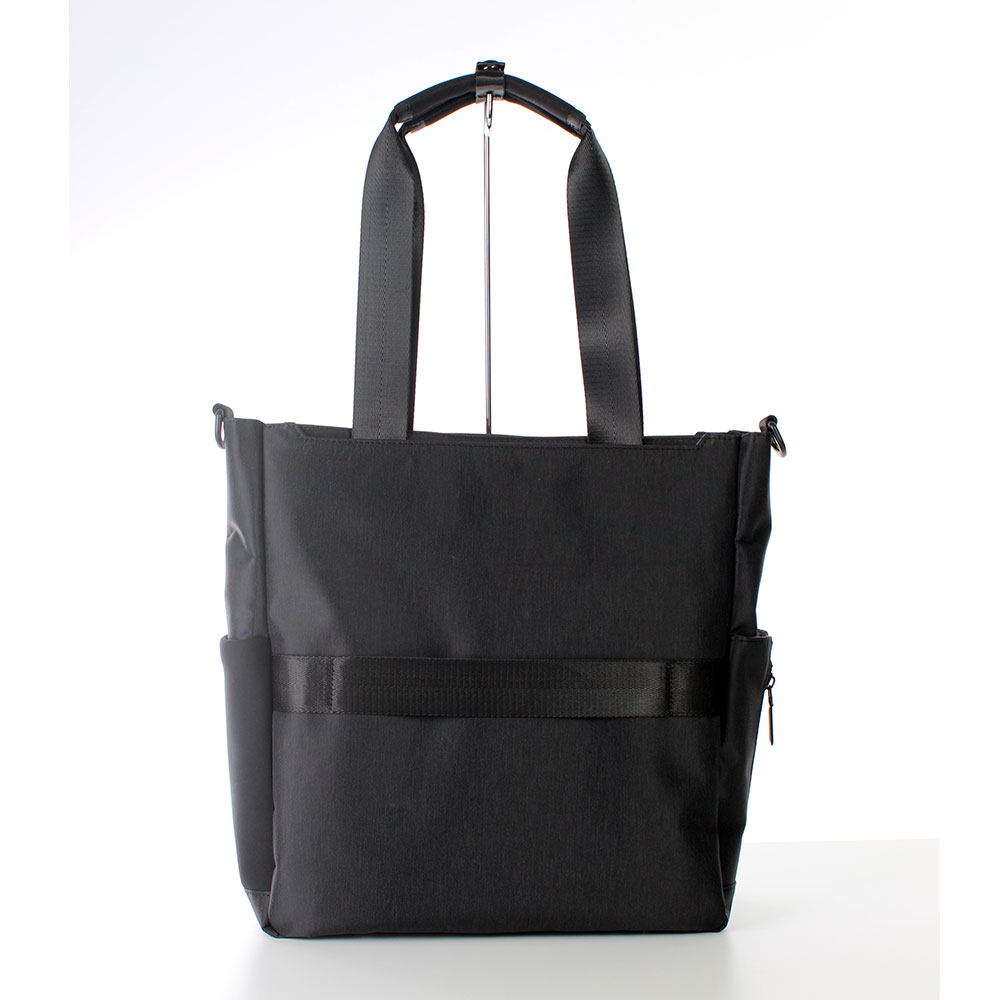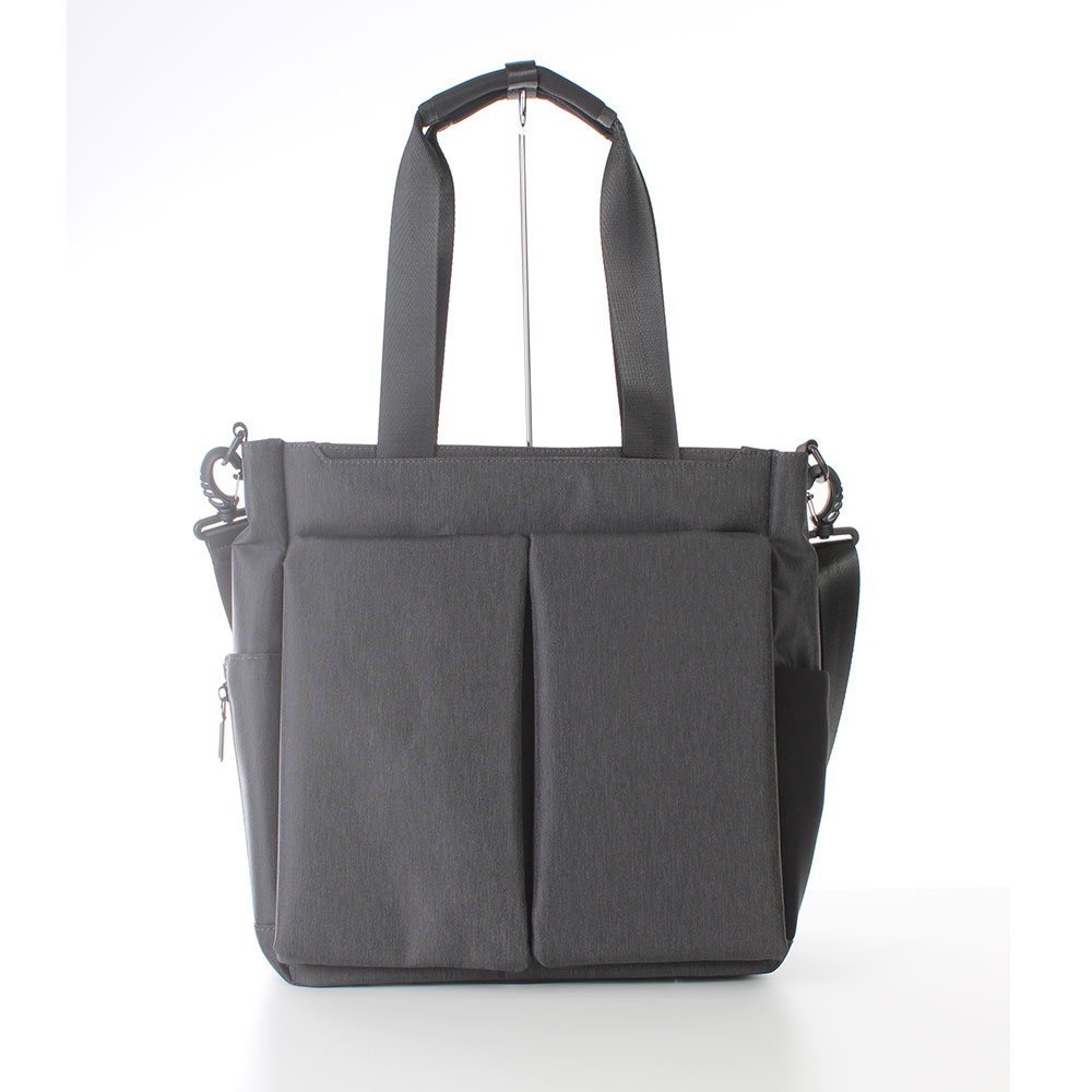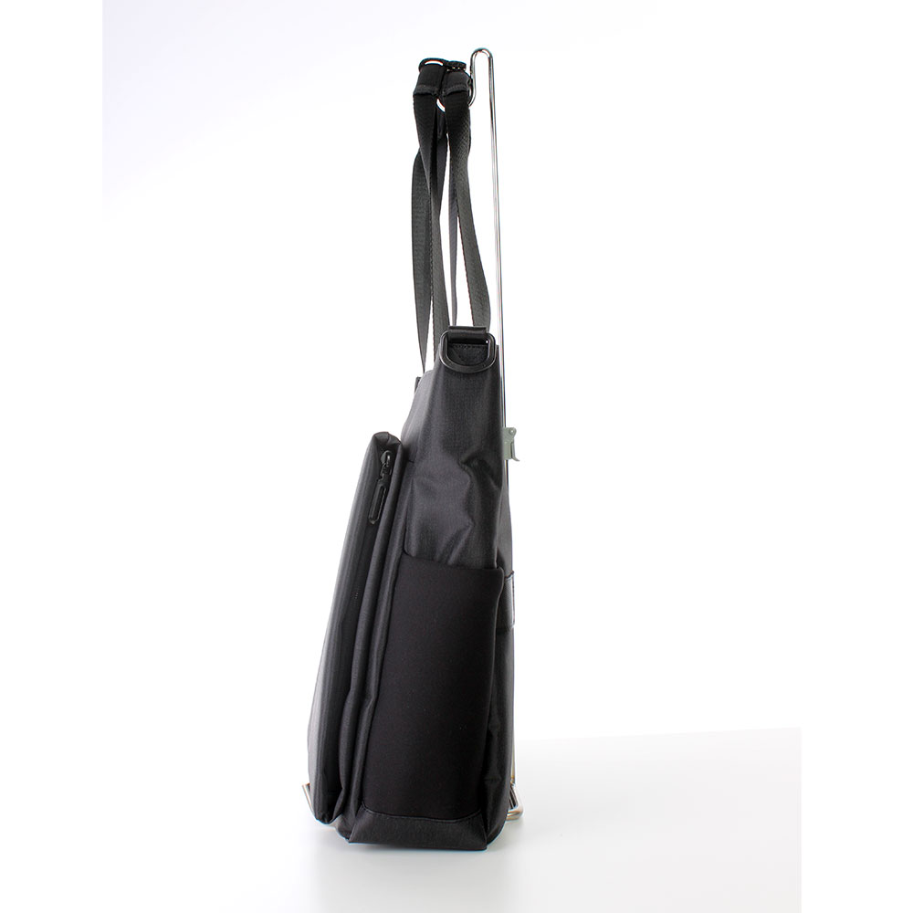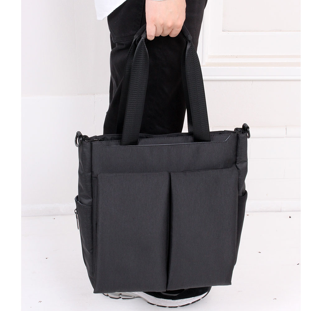 この2wayトートショルダーバッグは、撥水力の高いポリエステル素材で裏張りが施されているので形もしっかりしていて、しなやかなさらっとした肌触りがポイントの素材感で、上品でクールな印象を与えます。正面のスクエアポケットはそれぞれ外側にポケット口が付いていてトート持ちでもショルダー持ちでも取り出し易い仕様になっています。両サイドのポケットは片側は伸縮性のあるネオプレーンポケットで、もう片側はファスナー拡張機能のあるメッシュサイドポケットです。どちらもしっかりホールドしてくれます。背面にはキャリーバーも付いていてキャリーバッグの持ち手に引っかけて使っていただく事も出来ます。長さ調整可能なショルダーベルトも不要な時は外すことが出来る仕様になっています。トートの持ち手の先にはネオプレーンが巻かれていて、2本の持ち手を纏めることが出来る様にホックボタンも付いています。持ち心地も非常に良く、こちらの持ち手はそれぞれ、オープンポケットに収納することが出来る様な仕様になっています。底には傷が目立ちにくいシボ感のある合皮素材と金属の底鋲が付いているので衝撃を軽減してくれます。内装にはオープンポケット×1、ペン差し×2、メッシュポケット×1、ファスナーポケット×1、ウレタンポケット×1と非常に充実した仕様になっており、整理整頓がし易いです。