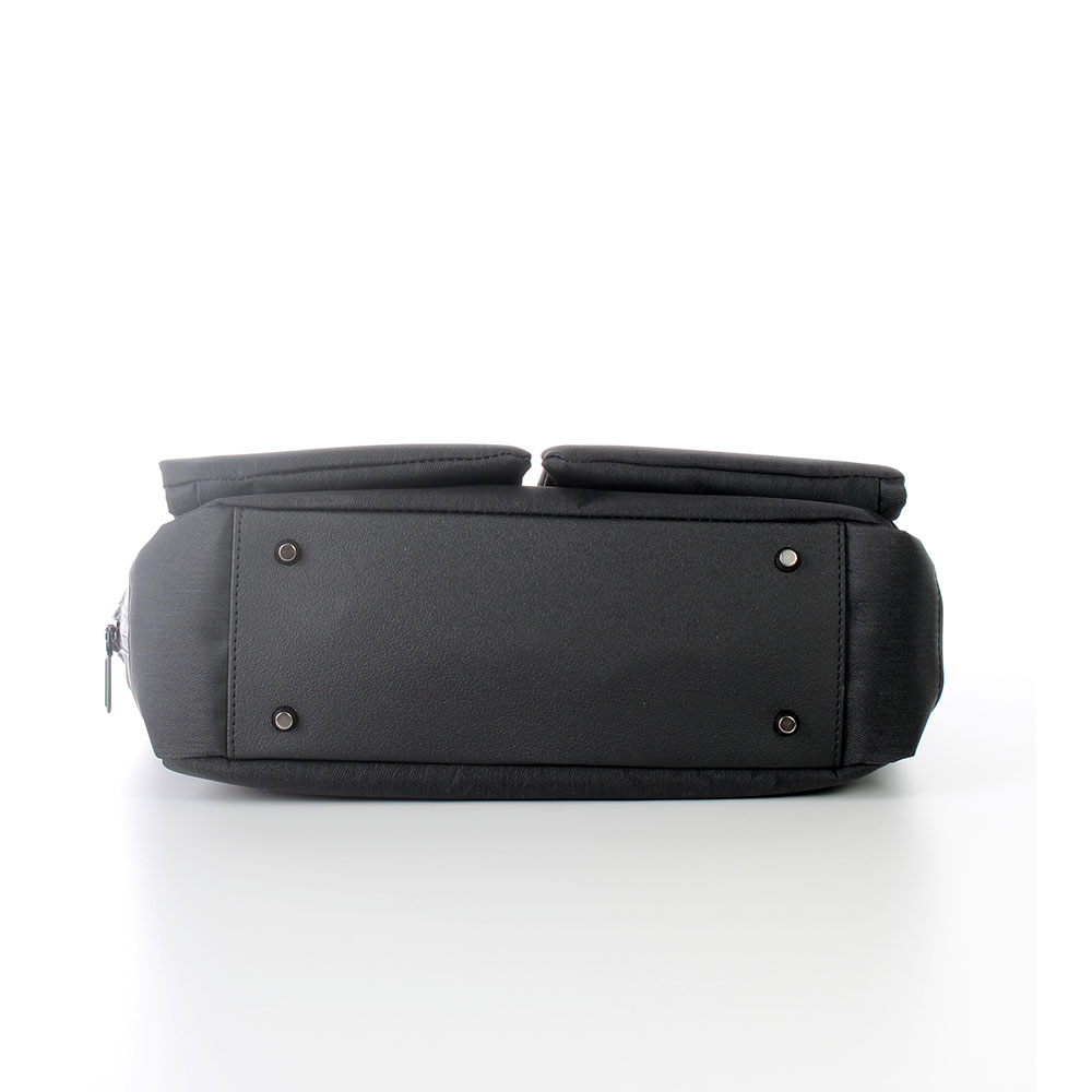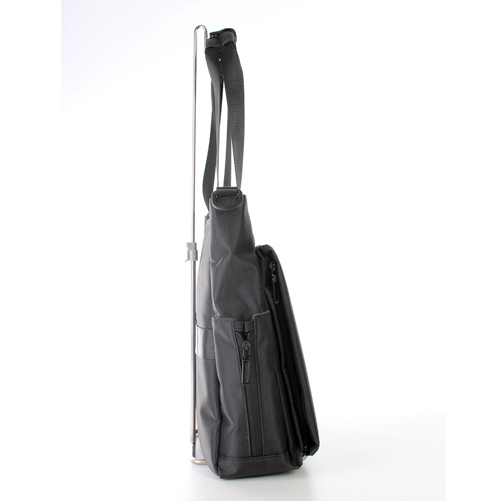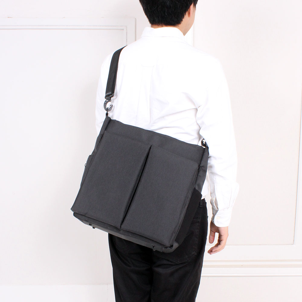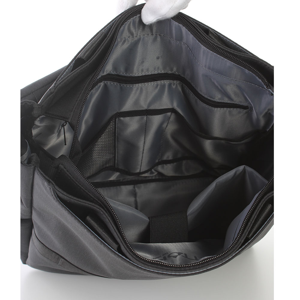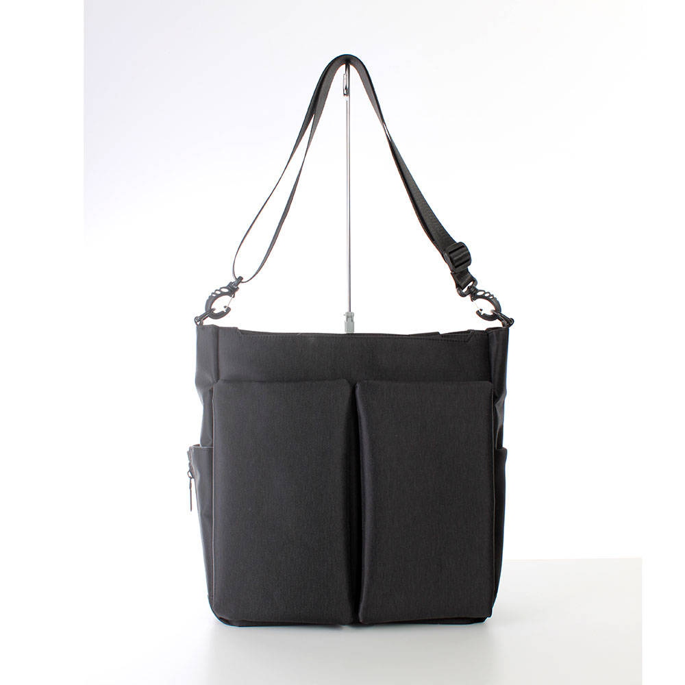 この2wayトートショルダーバッグは、撥水力の高いポリエステル素材で裏張りが施されているので形もしっかりしていて、しなやかなさらっとした肌触りがポイントの素材感で、上品でクールな印象を与えます。正面のスクエアポケットはそれぞれ外側にポケット口が付いていてトート持ちでもショルダー持ちでも取り出し易い仕様になっています。両サイドのポケットは片側は伸縮性のあるネオプレーンポケットで、もう片側はファスナー拡張機能のあるメッシュサイドポケットです。どちらもしっかりホールドしてくれます。背面にはキャリーバーも付いていてキャリーバッグの持ち手に引っかけて使っていただく事も出来ます。長さ調整可能なショルダーベルトも不要な時は外すことが出来る仕様になっています。トートの持ち手の先にはネオプレーンが巻かれていて、2本の持ち手を纏めることが出来る様にホックボタンも付いています。持ち心地も非常に良く、こちらの持ち手はそれぞれ、オープンポケットに収納することが出来る様な仕様になっています。底には傷が目立ちにくいシボ感のある合皮素材と金属の底鋲が付いているので衝撃を軽減してくれます。内装にはオープンポケット×1、ペン差し×2、メッシュポケット×1、ファスナーポケット×1、ウレタンポケット×1と非常に充実した仕様になっており、整理整頓がし易いです。