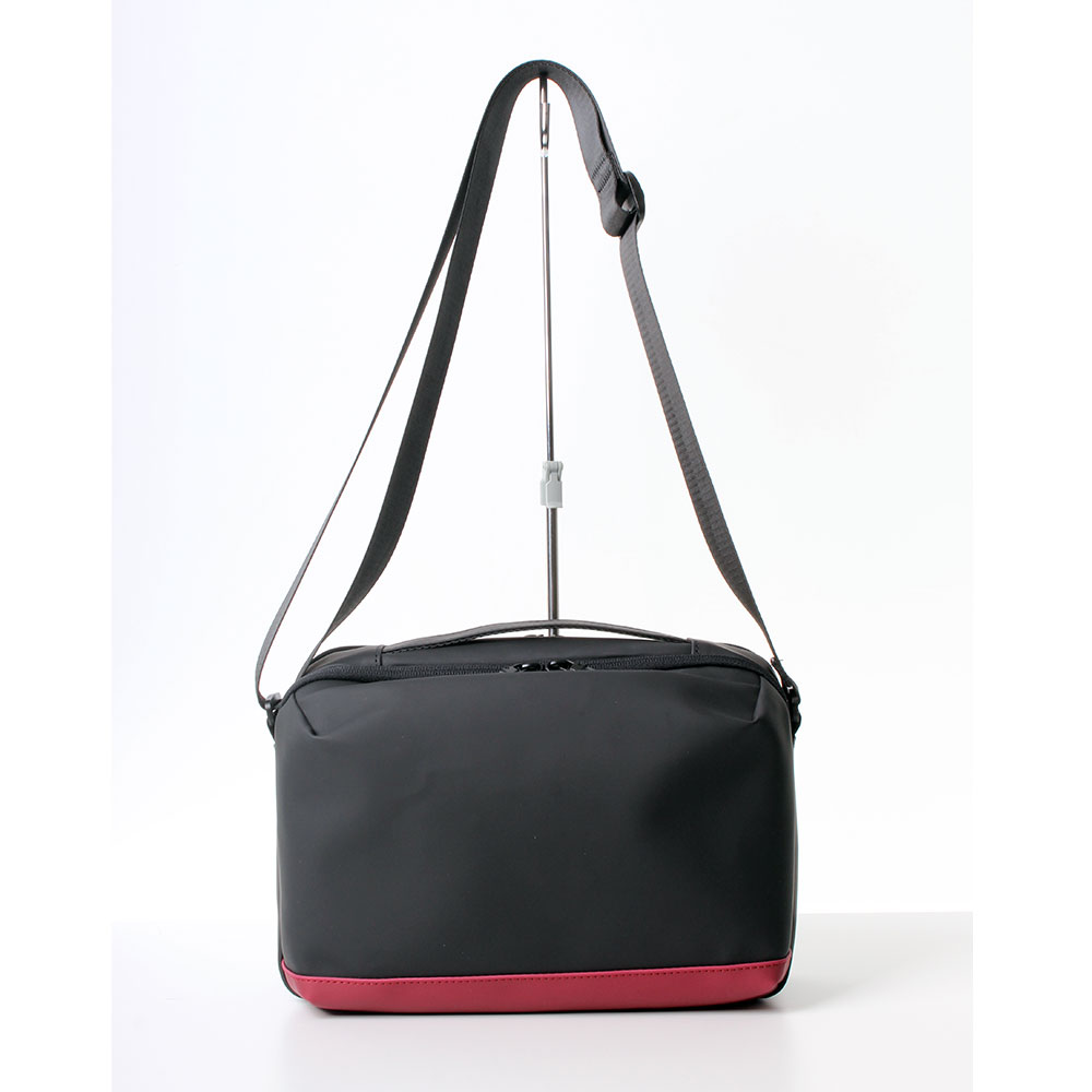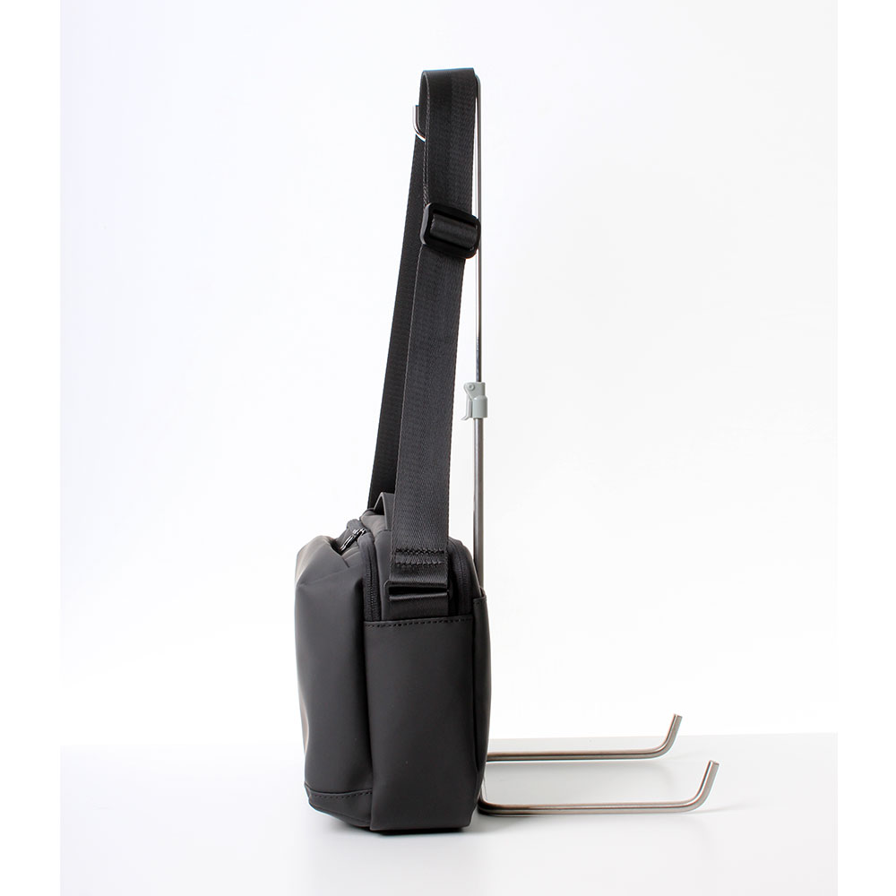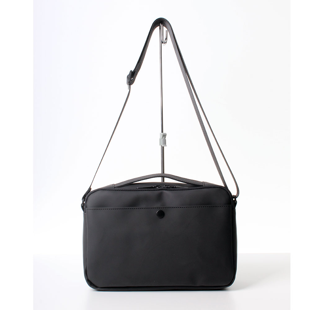素材は固すぎず柔らかすぎない丁度良い素材感に加えて、表面は水に強いPUコーティング素材で艶の無いマッドな質感で高級感があります。引手は黒メッキのスタイリッシュな金属引手で見た目の印象をグレードアップしてくれています。正面の大き目のポケットはトップにファスナー口があり、トップハンドルも搭載されているので持ちながらでも出し入れが簡単です。長さ調整可能なショルダーテープも光沢のあるさらっとした肌触りが特徴的な人字テープです。背面にはポケット口にホックボタンの付いたポケットがあり、スマホや鍵類などを簡易的に保存しておくのに便利です。ルームは2層に分かれておりメインルーム内装にはオープンポケット×2、ファスナーポケット×1で整理整頓もし易いです。背面側のルームにもオープンポケット×3付いており、機能も非常に充実しています。オンでもオフでもカジュアルに使える汎用性のあるスマートミニショルダーバッグです。
