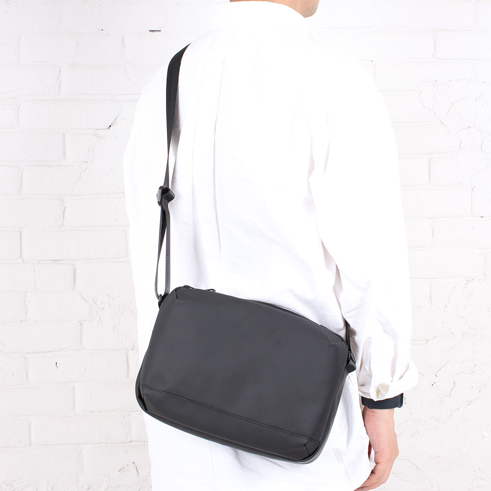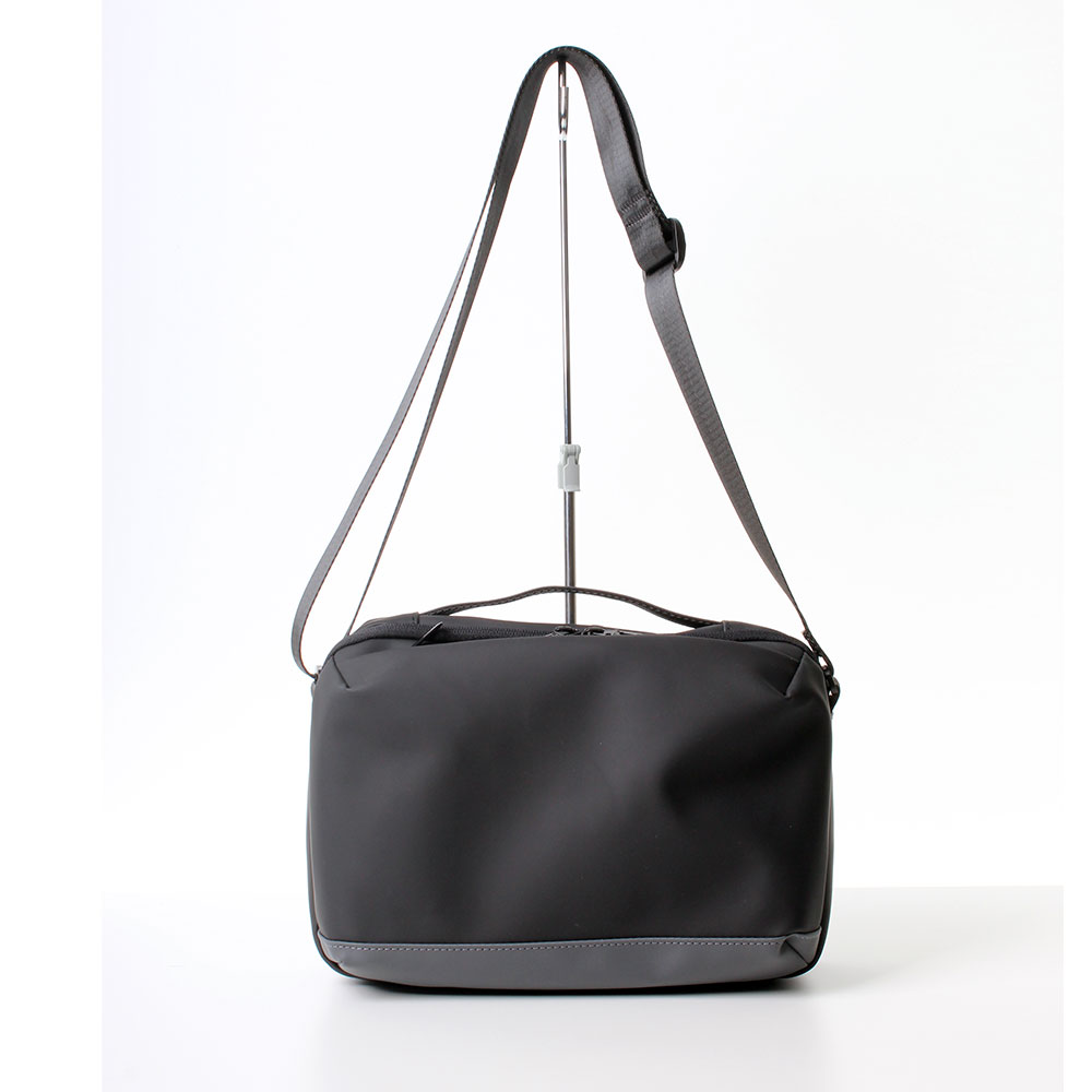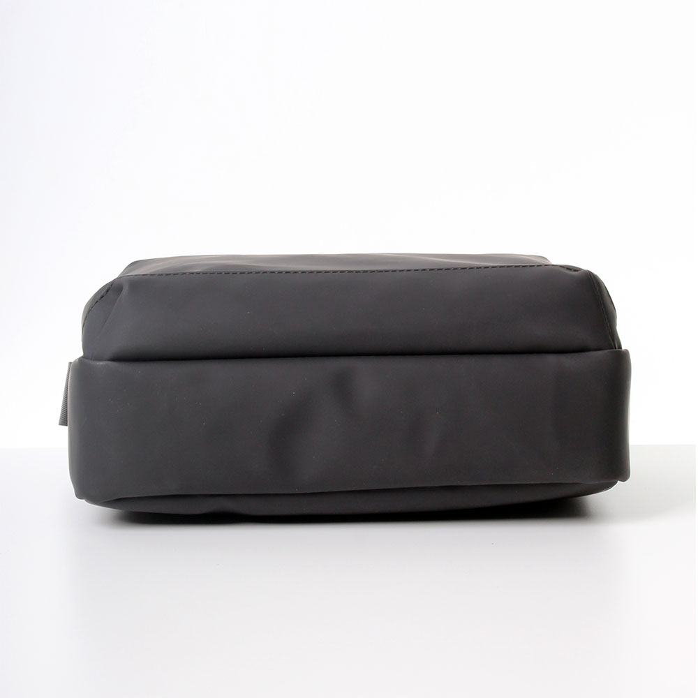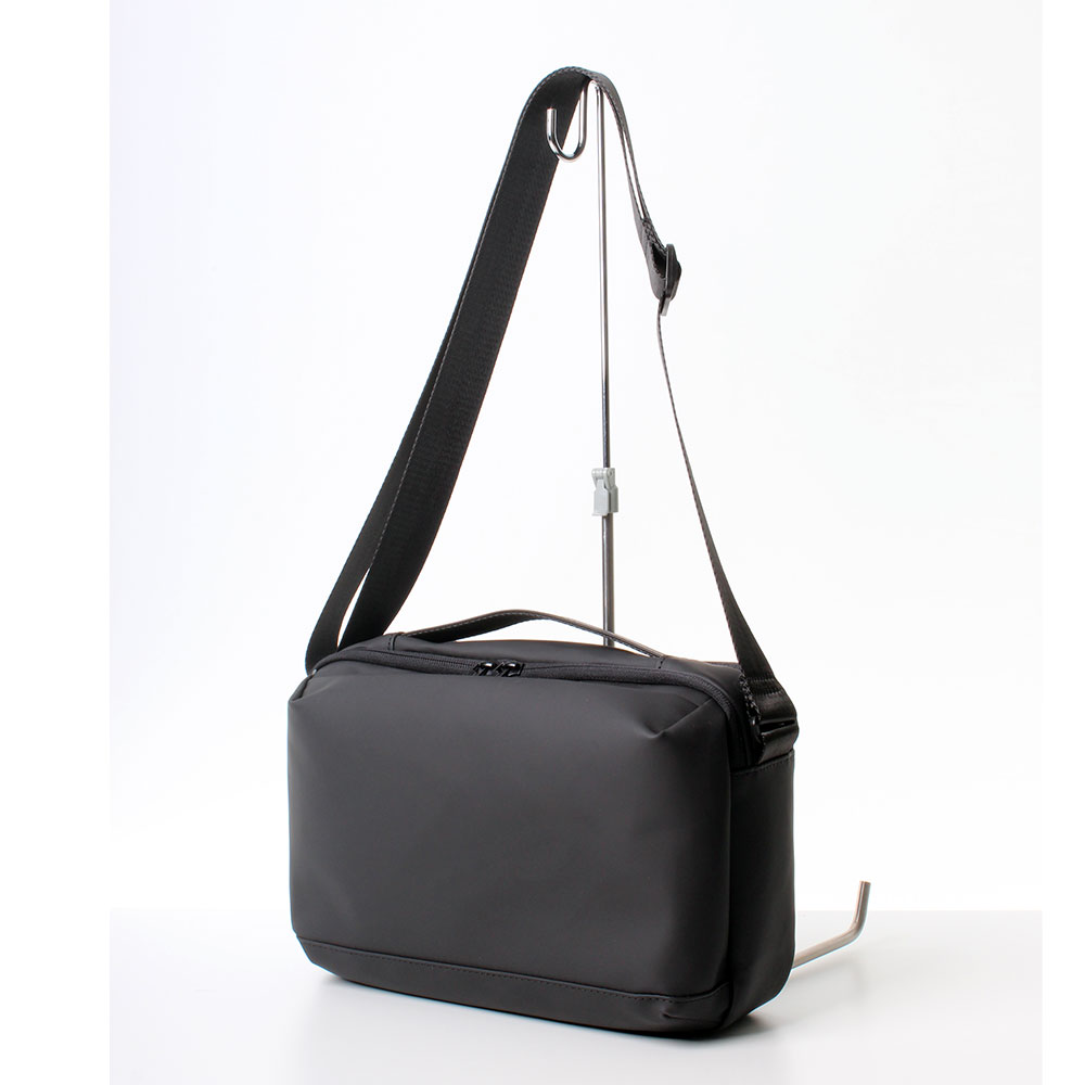 素材は固すぎず柔らかすぎない丁度良い素材感に加えて、表面は水に強いPUコーティング素材で艶の無いマッドな質感で高級感があります。引手は黒メッキのスタイリッシュな金属引手で見た目の印象をグレードアップしてくれています。正面の大き目のポケットはトップにファスナー口があり、トップハンドルも搭載されているので持ちながらでも出し入れが簡単です。長さ調整可能なショルダーテープも光沢のあるさらっとした肌触りが特徴的な人字テープです。背面にはポケット口にホックボタンの付いたポケットがあり、スマホや鍵類などを簡易的に保存しておくのに便利です。ルームは2層に分かれておりメインルーム内装にはオープンポケット×2、ファスナーポケット×1で整理整頓もし易いです。背面側のルームにもオープンポケット×3付いており、機能も非常に充実しています。オンでもオフでもカジュアルに使える汎用性のあるスマートミニショルダーバッグです。