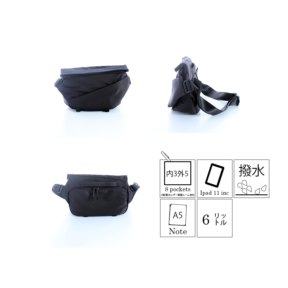 容量は6リッター入り、A5ノートも収納出来て普段使いの荷物には十分な容量です。